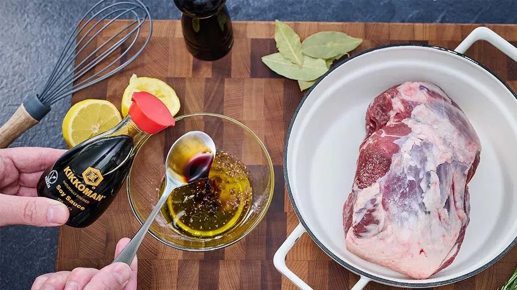 1 баранья нога, около 1 кг (без кости, при необходимости попросите мясника разрезать на 2 части) – ½ лимона – 5 ст. л. оливкового масла – 5 ст. л. соевого соуса натурального брожения Kikkoman – ½ ч. л. соли – ½ ч. л. свежемолотого перца – 5 лавровых листьев – 2 веточки розмарина