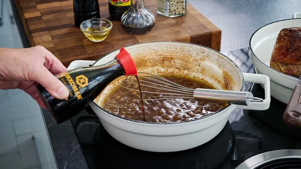 2 ст. л. гранул для приготовления соуса/подливы – 2 ½ ч. л. концентрата гранатового сока (или гранатовой мелассы) – 1 ½ ч. л. мёда – 3 ст. л. соевого соуса натурального брожения Kikkoman – ¼ ч. л. свежемолотого перца – 2 ч. л. смеси семян кунжута и чёрного тмина (нигеллы) (или 1 ч. л. семян кунжута и 1 ч. л. семян чёрного тмина (нигеллы)) – Несколько веточек петрушки