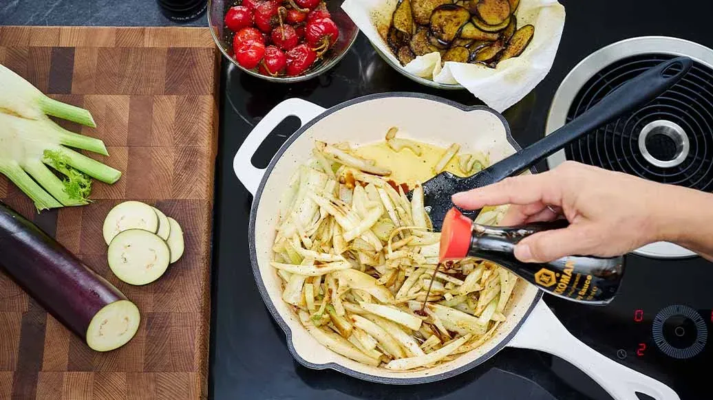 Нарежьте фенхель и баклажан, перцы оставьте целыми. Обжарьте каждый овощ отдельно на раскаленной сковороде в масле, приправьте соевым соусом Kikkoman и перцем.