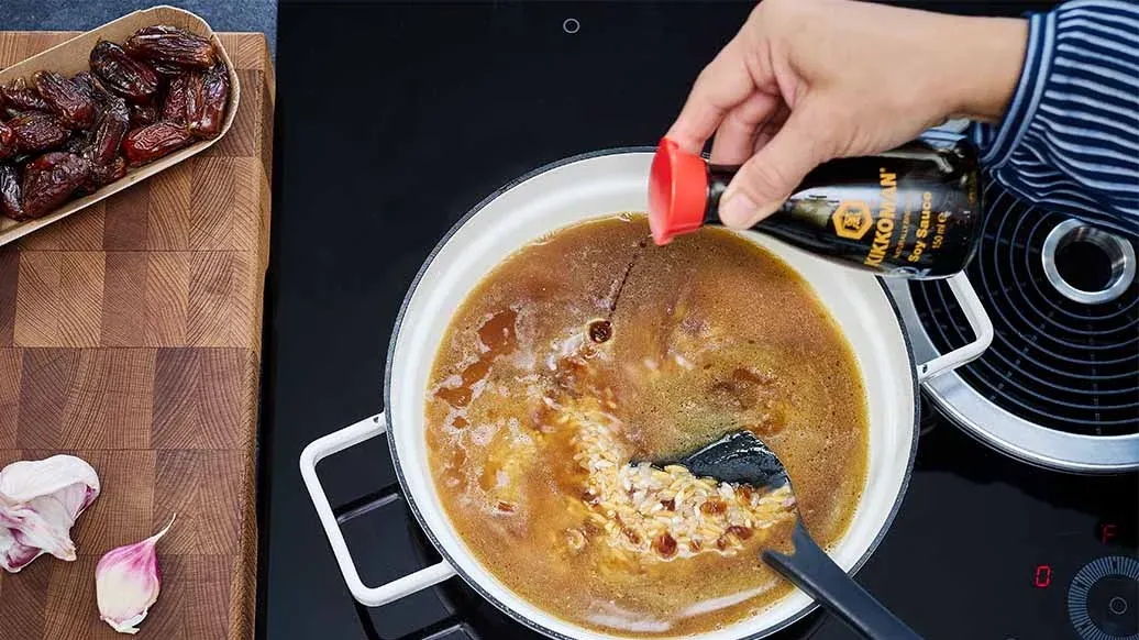 Для плова нагрейте сливочное и оливковое масло в кастрюле. Добавьте пасту орзо и обжарьте до золотистого цвета. Мелко нарежьте финики и чеснок, добавьте вместе с рисом и обжарьте несколько минут. Влейте бульон и, при необходимости, около 150 мл воды, а также соевый соус Kikkoman. Доведите до кипения, затем варите на небольшом огне, пока рис не впитает всю жидкость, регулярно помешивая.