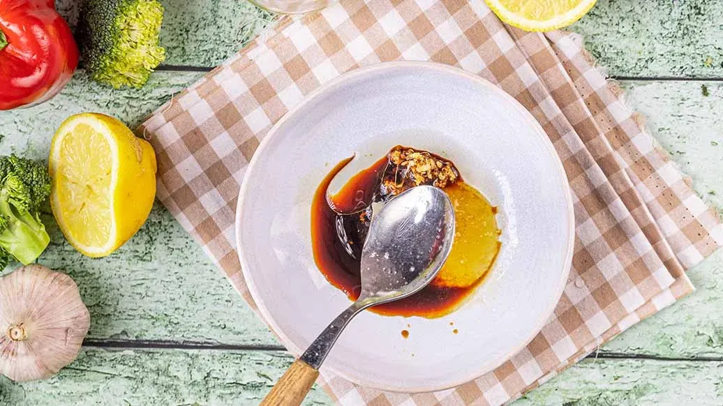 2 ст. л. соевого соуса натурального брожения Kikkoman – 1 ст. л. мёда – 1 ст. л. растительного масла – 1 ½ ч. л. тёртого имбиря – 1 ст. л. лимонного сока – 400 г филе куриной грудки