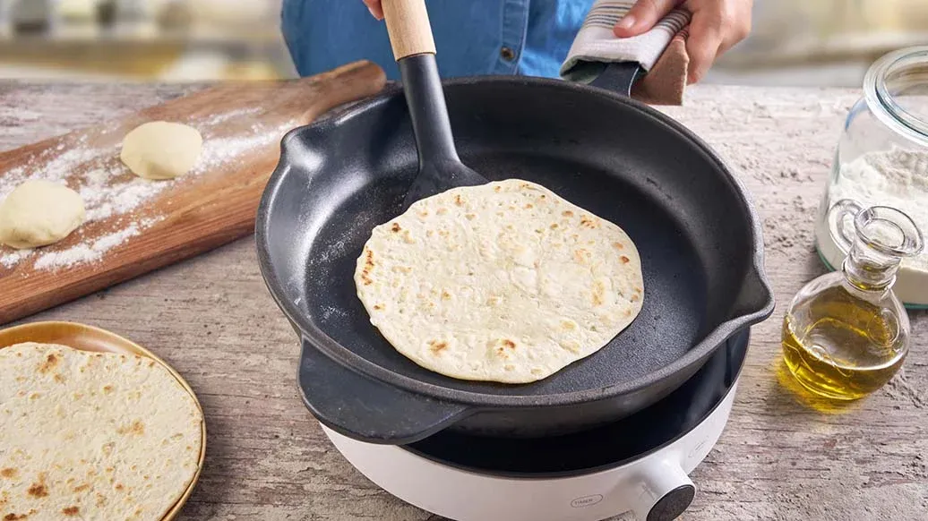 Смешайте чеснок с маслом. Постепенно добавьте тёплую воду к 150 г муки и перемешайте, затем добавьте чесночное масло. Замешивайте тесто около 5 минут, пока оно не станет гладким и эластичным. Оставьте на 20 минут в миске, накрытой влажной тканью или пищевой плёнкой. Разделите на 4 части, сформируйте шарики и раскатайте тонко, посыпая оставшимися 20 г муки. Нагрейте сухую сковороду на среднем огне и готовьте каждый чапати по 20–30 секунд с каждой стороны, пока не появятся золотистые пузырьки и подгоревшие пятна.