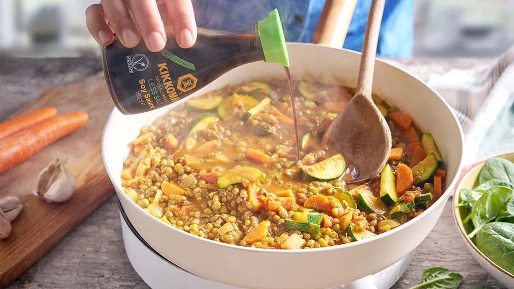 Ароматный дал из маша со шпинатом, морковью и томатами, с добавлением лимона, цедры лайма и слабосоленого соевого соуса Kikkoman.
